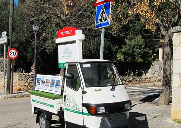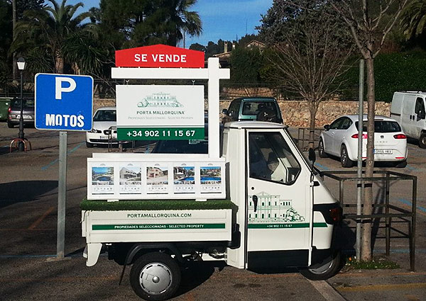 Pequeño, agil y blanco de todas las miradas. Asi es el coche Ape de Porta Mallorquina que circula sobretodo por el noroeste de la isla. Una vez estacionado, las ofertas inmobiliarias llaman la atención de los transeuntes. Una gran idea de nuestros socios en el Noroeste!