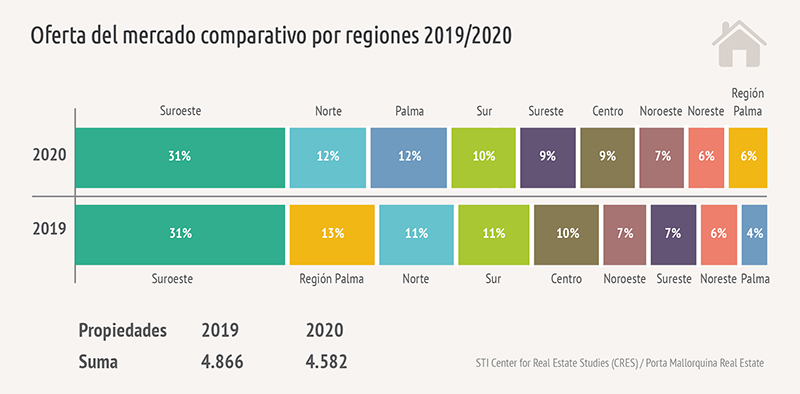 La distribución en la región se mantuvo relativamente constante, con una de cada tres propiedades ubicadas en el suroeste, y el resto se extendió uniformemente por toda la isla. Solo la oferta en el área de Palma se redujo significativamente en comparación con el año anterior, del 13% al 6%.