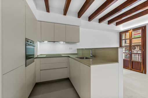 El piso, con una superficie construida de 73,25 m², está situado en la primera planta. Al entrar, se accede por la izquierda a la zona de salón-comedor con una cocina abierta que ofrece vistas al pintoresco casco antiguo de Palma. Gracias a las antiguas vigas de madera del techo, el encanto mallorquín de este piso se ha conservado muy bien.