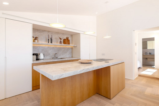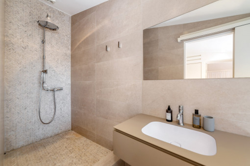 La gran terraza con vistas al mar de aprox. 20 m2 ofrece mucho espacio para pasar horas acogedoras bajo el sol mediterráneo casi todo el día, ¡mientras disfruta de una fantástica vista de 180 grados de la bahía de Palma!