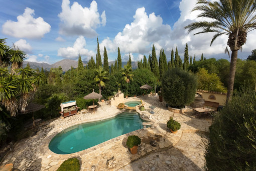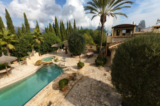 La zona exterior se caracteriza por zonas verdes bien cuidadas, árboles maduros, una zona de barbacoa con horno de leña y un alto grado de privacidad. Una terraza en la azotea con bar, accesible desde el exterior, ofrece maravillosas vistas de la Tramuntana y de los alrededores de Pollensa.
